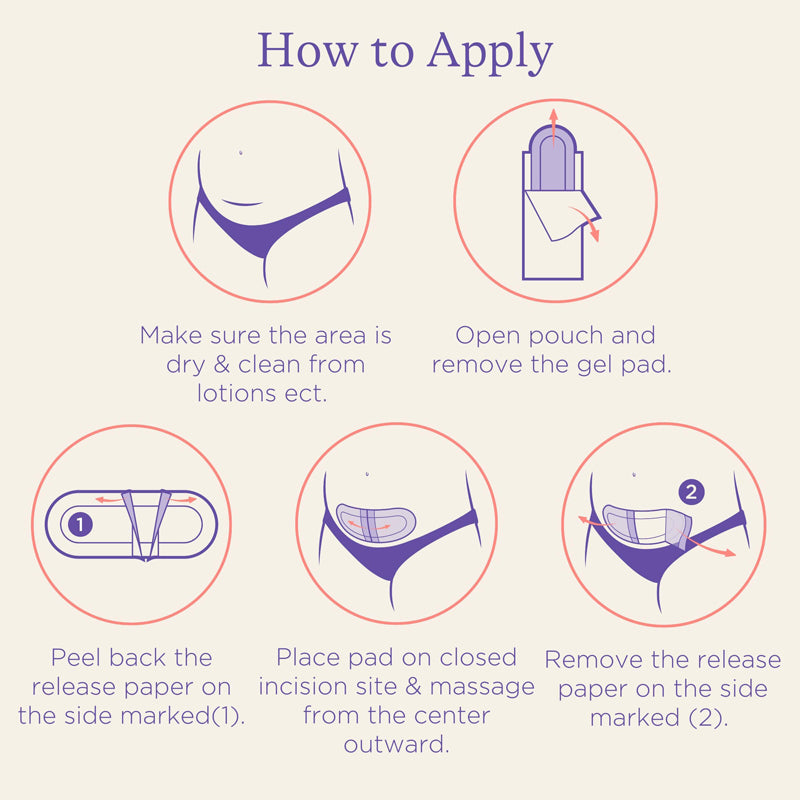 For use from 10 days post-surgery, when the incision wound has been assessed by your midwife to make sure it is clean, closed, and dry to avoid any infections. Ensure the area is clean and dry before applying the hydrogel pad. Open pouch and remove the gel pad then peel back the release paper on the side marked (1). Gently place the gel side of the pad directly over your closed incision site. Apply the pad by massaging the area using a smooth motion from the centre outwards before removing the release paper on the side marked (2). For an extra cooling effect, refrigerate unopened pads before use. To remove, hold the centre of the pad and gently pull the pad edge outward to release the adhesive. Continue to pull the edge, stretching outward (not upward) and in the same direction of any hair growth.