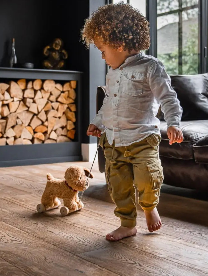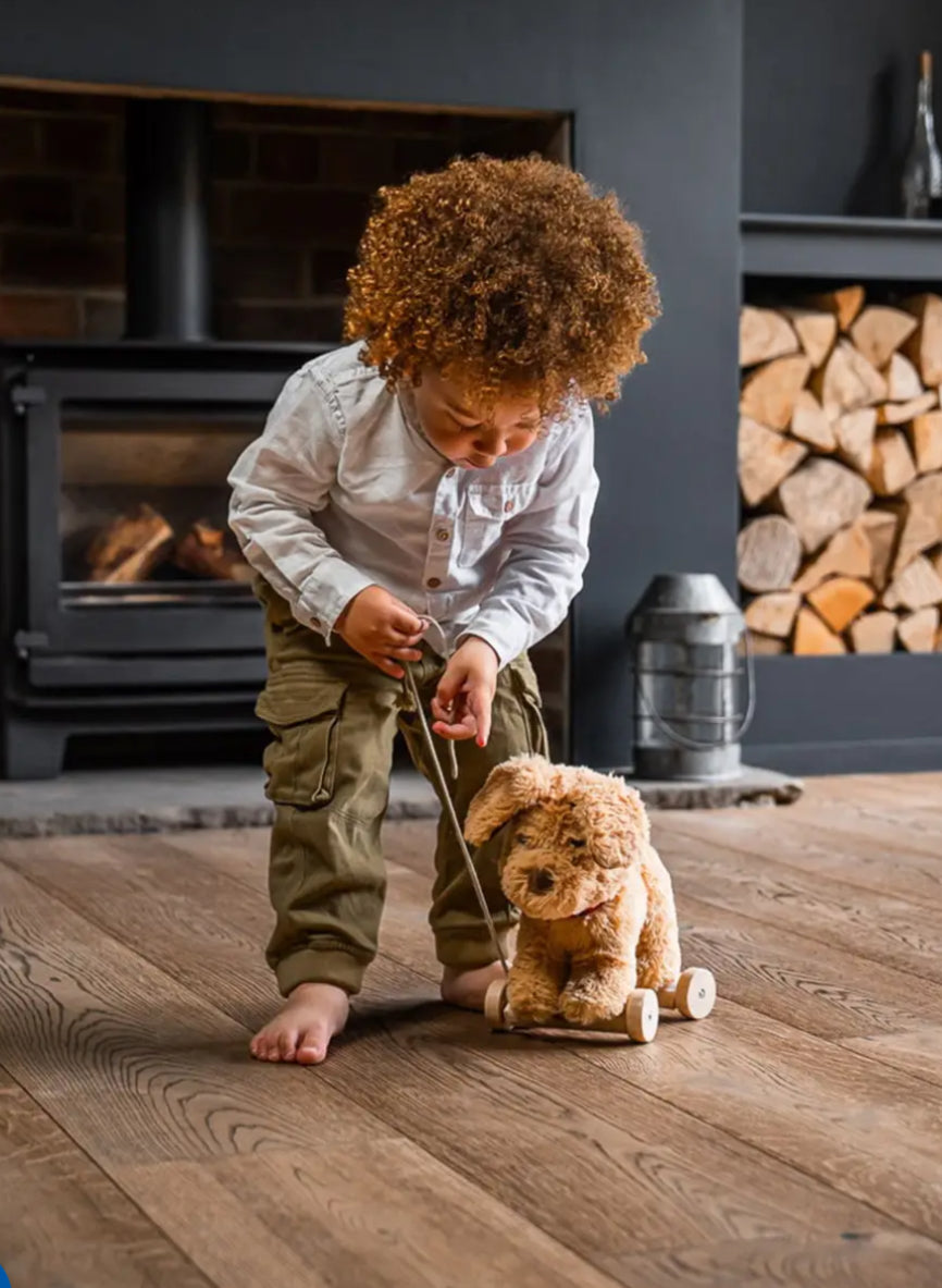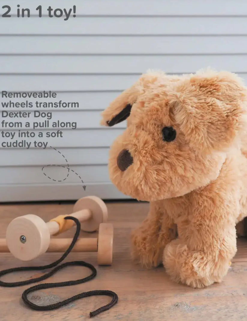 Dexter is the perfect loyal toy dog to walk through adventures and beyond! This gorgeous pull along dog Labrador features super soft fur, a cute little button nose, and ears that rustle. With removable wooden wheels, Dexter Dog not only makes for a charming pull along dog but also doubles as a huggable friend.