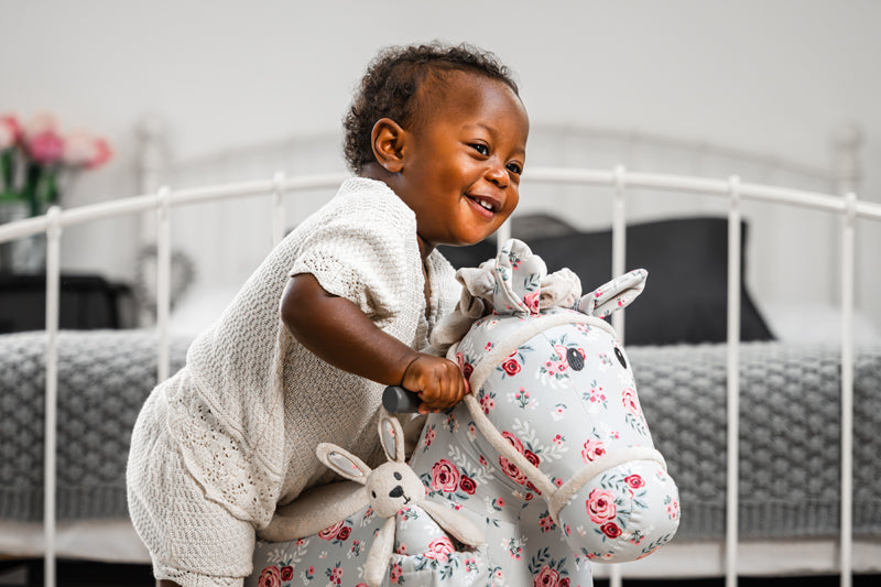 Introducing the most enchanting rocking horse of them all! Lily’s delicate and romantic charm shines through her traditional floral fabric, adorned with vibrant pink roses on a soft grey backdrop. Nestled in her pocket is Rose, a delightful little bunny toy that can pop out for playtime fun anytime!