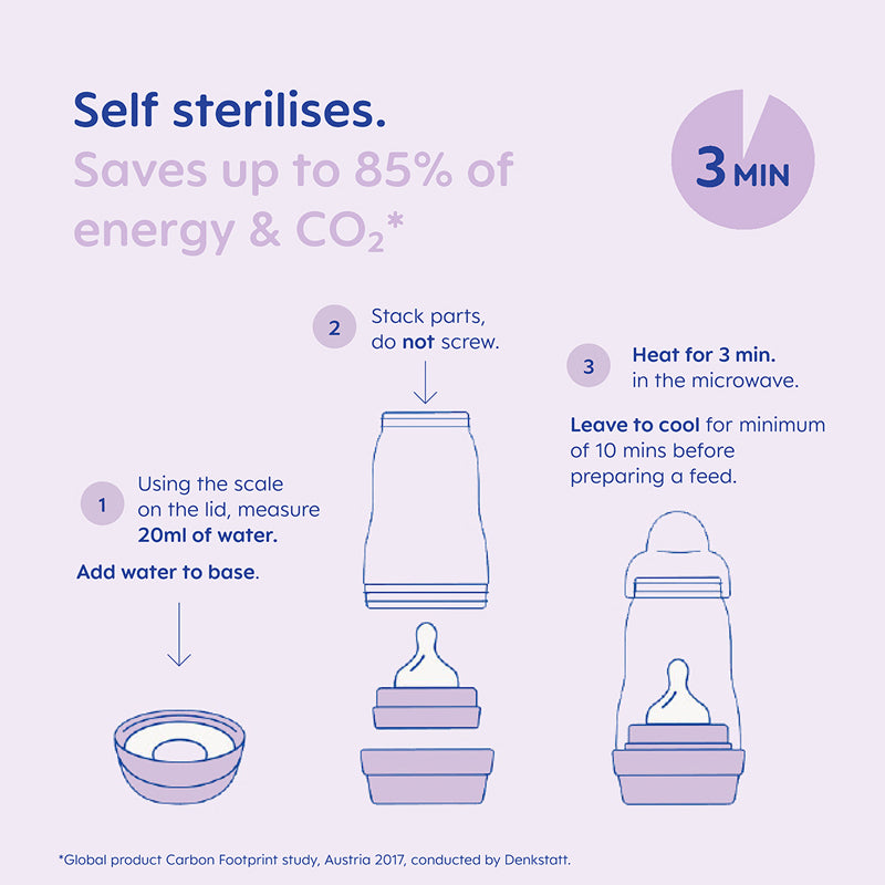 The Anti Colic Bottle self-sterilises in 3 easy steps ensuring simple safe bottle cleaning at home or on the go. These bottles can self-sterilise in 3 minutes in a microwave, so is a great choice for feeding on the go.