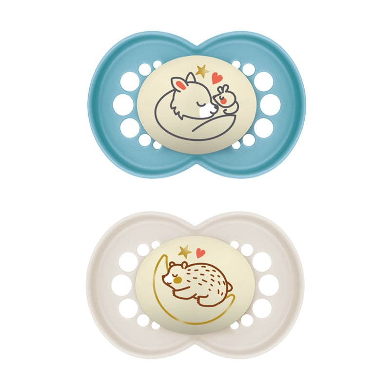 MAM Night soothers glow extra bright at night time, making them easy to find in the dark with little disturbance to your little one.