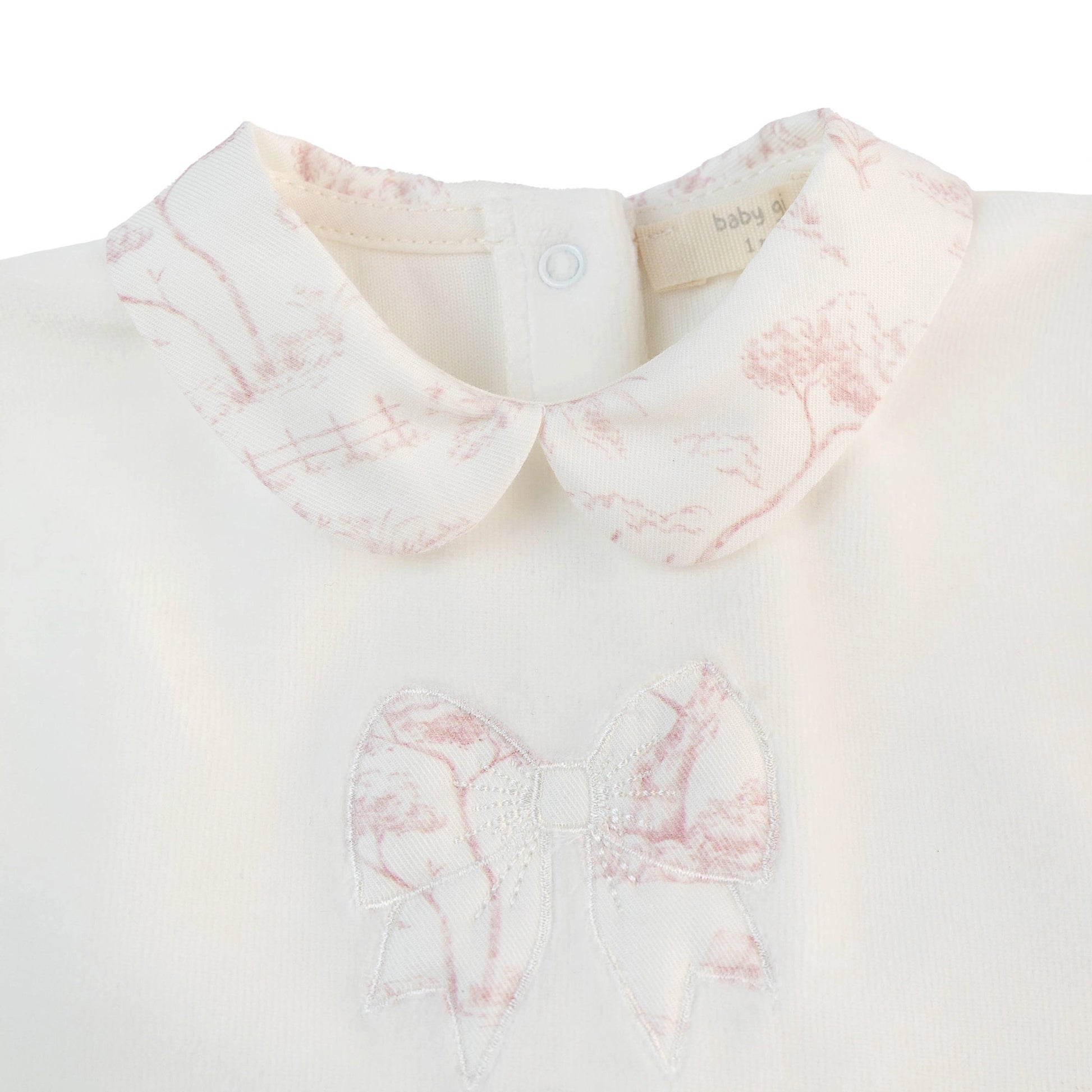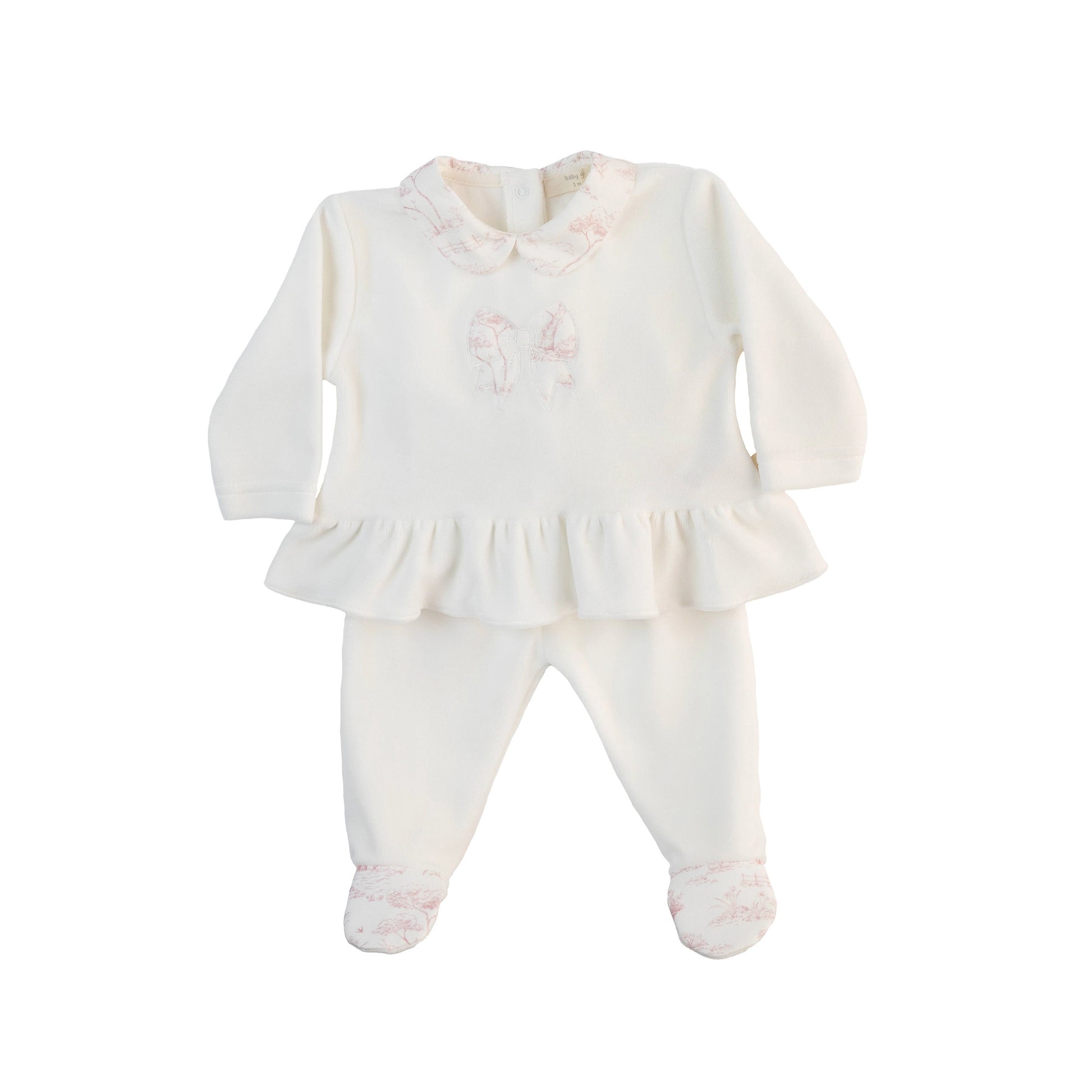 Stunning velour two piece from Baby Gi with vintage floral print frill collar and bow.
