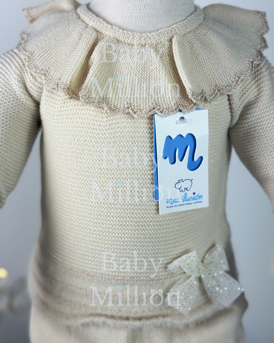 BABY OUTFIT INCLUDES KNITTED SWEATER, CULOTTE, BONNET AND BOOTIES