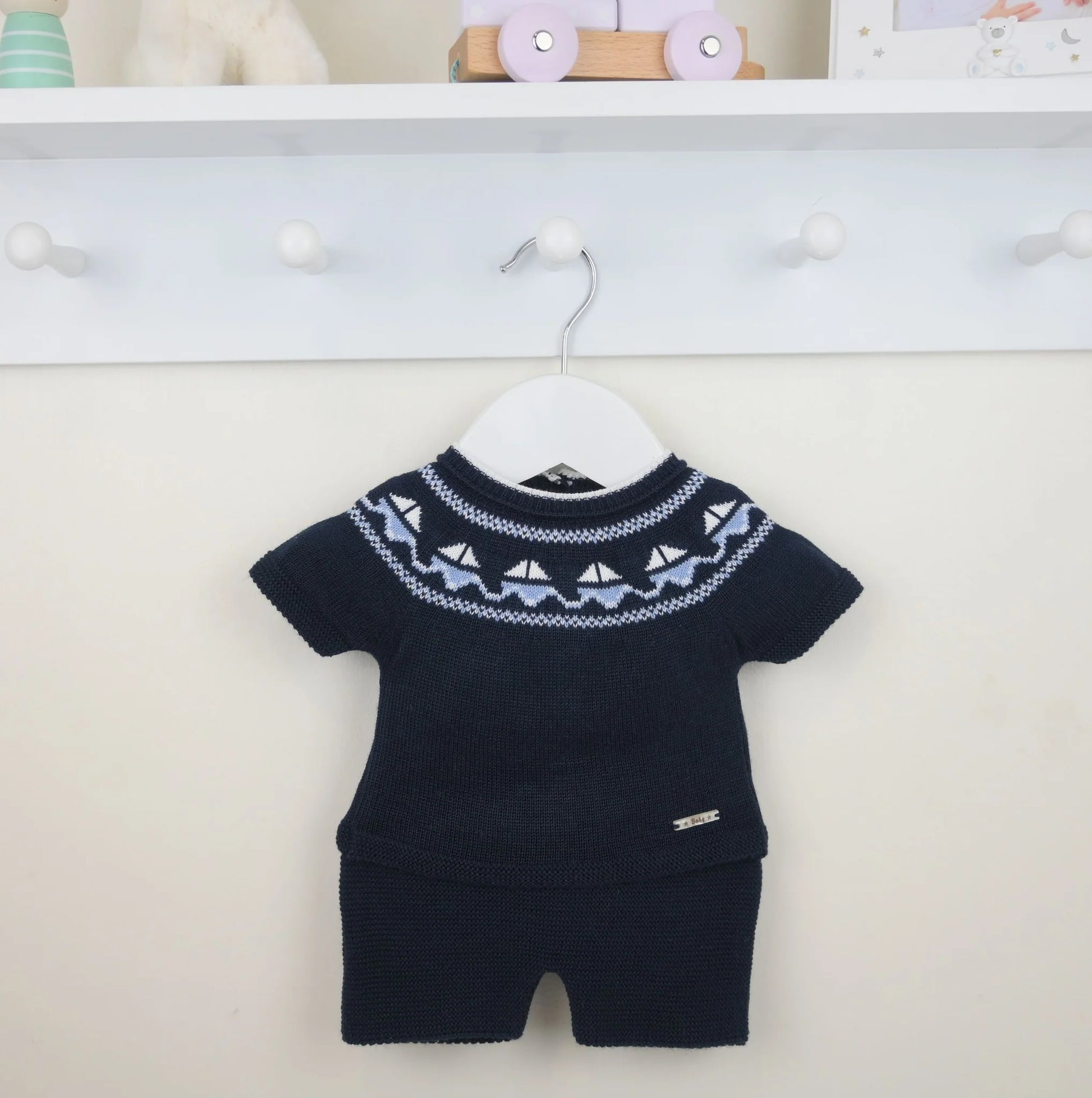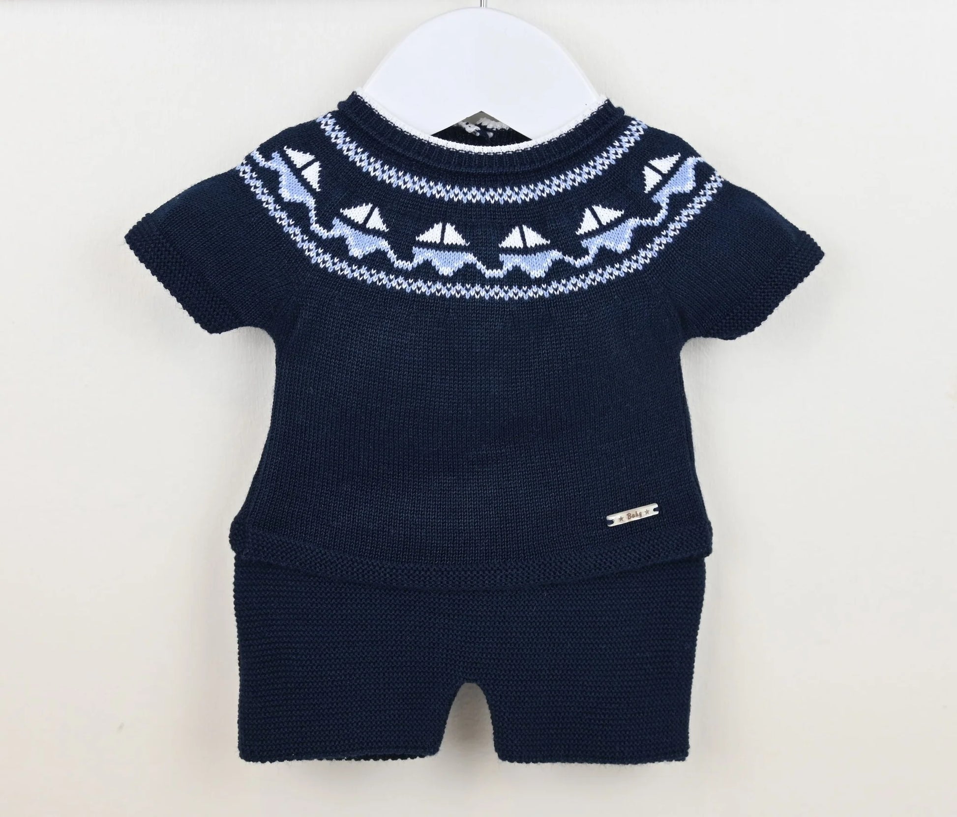 This fabulous little nautical two-piece set features a super soft knitted short sleeved top with classic "boats on the sea" design. Handy pearl buttons run down the back for quick changes. With a lovely little pair of matching shorts. Just perfect for days in the sunshine!