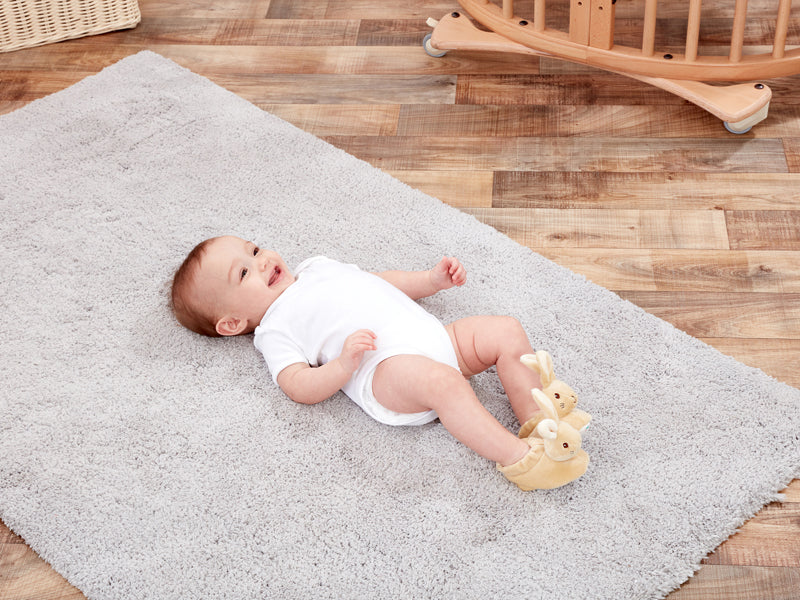 See the joy on your baby’s face as they discover the sounds in their feet and develop their gross motor skills as they learn how to make them rattle!